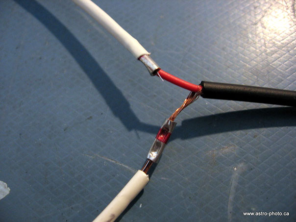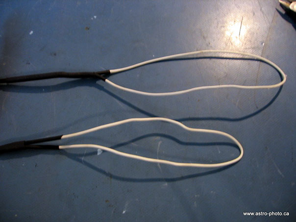 - Sertir un extrémité du fil NiCr au conducteur central du fil RCA (positif), placer et chauffer le tube rétrécissant.